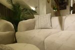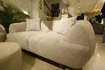 يعتمد التصميم على درجات البيج الدافئ مع لمسات الخشب الطبيعي الداكن التي تضيف عمقًا وأناقة، ويبرز الحائط الخلفي بشرائح خشبية رأسية مع إضاءة خطية مدمجة تمنح بعدًا معماريًا عصريًا يعزز الإحساس بالارتفاع والانسيابية، بينما تضيف الطاولات الوسطى العضوية بسطح رخامي عروق طبيعية لمسة فنية راقية تكسر الخطوط المستقيمة،.