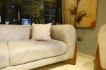 يعتمد التصميم على درجات الرمادي الفاتح مع لمسات خشبية دافئة في قواعد الكنبات والطاولة الوسطى مما يخلق توازنًا أنيقًا بين البرودة والدفء، وتمنح الخطوط المستقيمة للكنب إحساسًا بالبساطة العصرية، بينما تضيف الطاولة ذات السطح الخشبي والتفصيلة البيضاء لمسة تصميم حديثة عملية، كما تعكس الأرضيات الفاتحة الإضاءة الطبيعية القادمة من الواجهة الزجاجية الكبيرة لتمنح المكان إحساسًا بالاتساع والنقاء.
