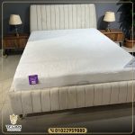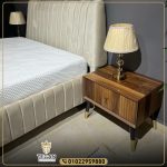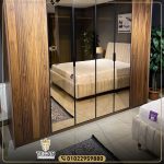 الغرفة بتعتمد على دفء الخشب الطبيعي بلون والنت مع تنجيد بيج هادئ في السرير، ما يخلق تباينًا راقيًا بين الدفء والنعومة. التصميم مودرن أنيق بخطوط مستقيمة وتفاصيل طولية في الخشب تعزز الطابع العصري الفخم، بينما الأبواب المرايا في الدولاب تضيف اتساع بصري ولمسة عملية في نفس الوقت.