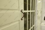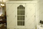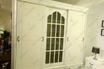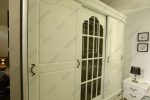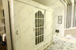 الدولاب: دولاب خشبي كبير بلون أبيض مع أبواب زجاجية تحتوي على تصميم شبكي يضيف لمسة من الفخامة.