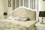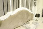 السرير: سرير مريح بتصميم بسيط وأنيق مع ظهر مبطن بلون بيج فاتح.