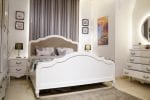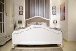 السرير: سرير أنيق بلون أبيض مع تصميم منحني في الإطار يضيف لمسة تقليدية. الوسائد بألوان محايدة تتماشى مع باقي الغرفة.