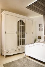 تنظيم عملي: الدولاب الكلاسيكي يوفر تخزينًا كبيرًا، بينما تسريحة المرآة تضيف لمسة عملية وعصرية.
