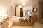 • تصميم غرفة بسيط ومعاصر مع تفاصيل دقيقة، مثل الخشب الفاتح والإضاءة التي تضفي جوًا مريحًا في الغرفة.