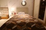 • سرير مريح ذو رأس سرير مبطن بألوان دافئة، مما يضيف لمسة من الراحة.
