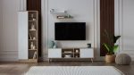 وحدة تلفزيون عصرية تجمع بين لون أوف وايت هادئ وخشب طبيعي دافئ بتفاصيل هندسية ناعمة على الأبواب تضيف لمسة تصميم مميزة.