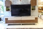وحدة تليفزيون بتصميم عصري يجمع بين البيج الفاتح والخشب البني الدافئ مع خلفية رمادي رخامي أنيقة تضيف لمسة فخامة هادئة، وتضم أدراج سفلية للتخزين مع أرفف جانبية مفتوحة ومغلقة لعرض الديكورات، لتكون قطعة عملية وأنيقة تناسب المساحات العصرية.