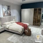 تعتمد الغرفة على تناغم راقٍ بين الأوف وايت والبيج الهادئ مع جدار خلفي بلون بترولي عميق يضيف فخامة وعمق بصري للمساحة. التصميم مودرن بخطوط مستقيمة وأسطح ناعمة تعكس البساطة الراقية، بينما يضيف الجزء الزجاجي في الدولاب لمسة عصرية خفيفة تكسر هدوء الألوان وتمنح إحساسًا بالاتساع والتنظيم. الغرفة متناسقة في الألوان ما بين الأبيض والبيج الفاتح مع تفاصيل خشبية رقيقة، لتمنحك إحساس بالراحة والدفء في كل زاوية.